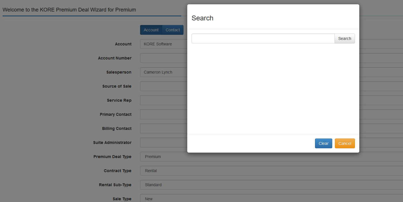 In the Premium Deal Wizard, when building deal at Account level, instead of having to search for a name first, display all contacts related to an account for user to select from. If the contact is not listed, user would still have the option to search.