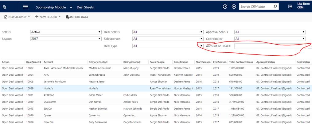 Our finance & legal team are on the system and occasionally need to search for accounts when all they have is the legal name (because that is what was listed on the contract). They can search from accounts now (that I’ve added it) but it would be nice to search for the legal name directly out of deal sheets if possible.